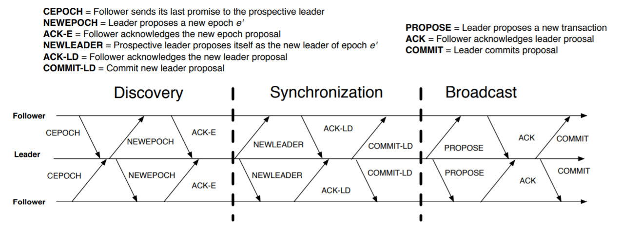 Zab には discovery, synchronization, broadcast の 3 つのフェーズがある。それぞれのプロセスは一度にこのプロトコルの 1 つの反復を実行し、プロセスはいつでもフェーズ 1 に進むことで現在の反復を止めて新しい反復を開始することができる。Zab プロセスがプロトコルにしたがって実行できる役割にはリーダーとフォロワーの 2 つがある。リーダーは同時にプライマリの役割を実行し、プライマリのブロードキャスト呼び出しの順序に従ってトランザクションを提案する。フォロワーはプロトコルのステップにしたがってトランザクションを受け入れる。リーダーはフォロワーとしてのステップも実行する。