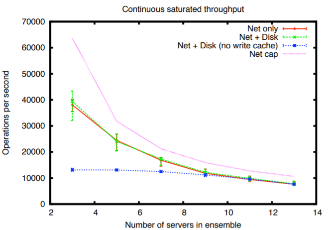 ディスク書き込みキャッシュをオフにすると Zab は I/O バウンドとなり、スループットはサーバ数に対してほぼ一定となる。7 台以上のサーバではトランザクションがディスクに記録されるときに同一ネットワークのみにボトルネックが存在するため、サーバ数が増えるとスループットが低下してしまう。