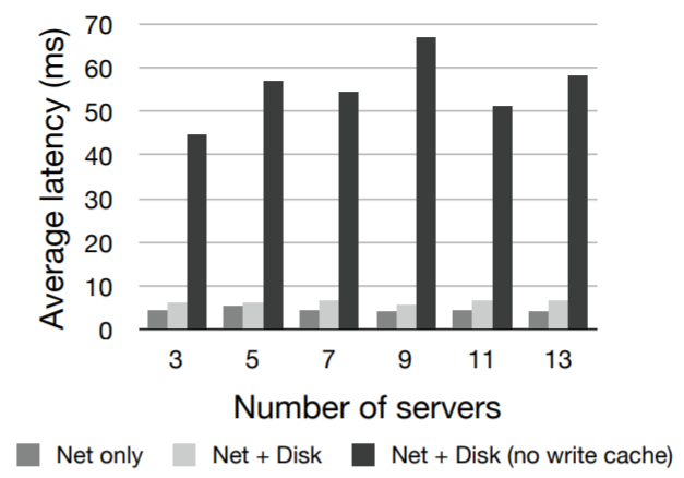 b) レイテンシー: Fig 7 はリーダーが単一の操作をコミットする際のレイテンシーを示している。ping を使用してサーバ間の基本的なレイテンシーを測定したところ 100 マイクロ秒だった。ベンチマークタイマーの分解能はミリ秒である。