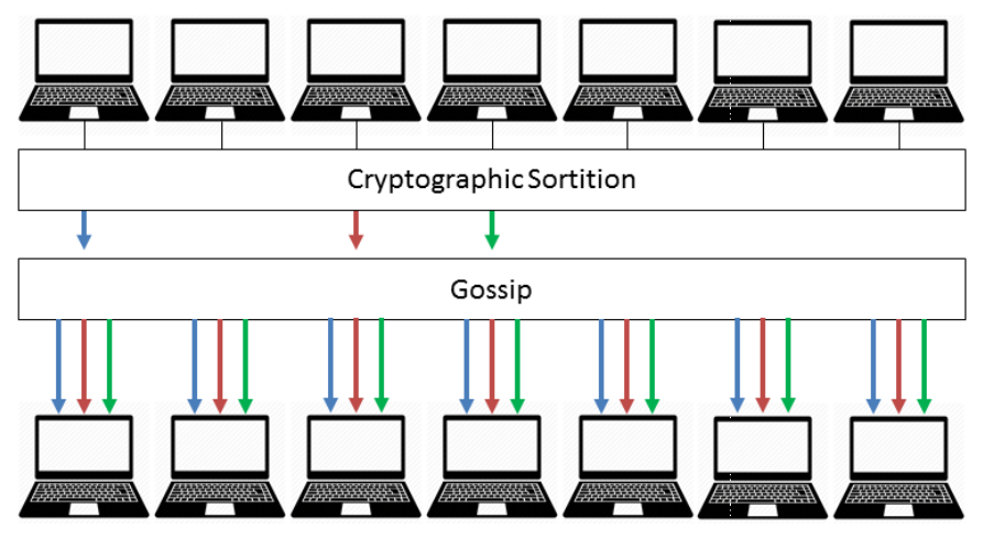 ゴシッププロトコル. Algorand は (Bitcoin に類似した) ゴシップネットワークを実装し、各ユーザがゴシップメッセージの送信先となるピアの小さなランダムセットを選択する。メッセージが偽造されないように、全てのメッセージは下の送信者の秘密鍵で署名される。他のユーザは、中継する前に署名が有効であることを確認する。転送ループを回避するためにユーザは同じメッセージを 2 回中継してはいけない。Algorand は TCP を介してゴシップを実装し、所有する金額に基づいてピアの選択を比較検討し汚染攻撃 (pollution attack) を軽減する。