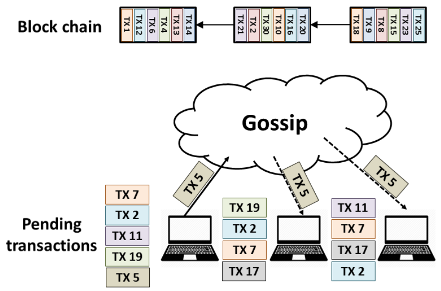Algorand ユーザはゴシッププロトコルを介して通信する。ゴシッププロトコルは、ユーザが新しいトランザクションを送信するために使用される。各ユーザは Figure 1 に示すように、次のブロックを提案するために選択された場合に備えて、自分がリッスンした保留中のトランザクションのブロックを収集する。Algorand は \(BA\star\) を使用してこれらの保留中のブロックの 1 つについて合意に達する。