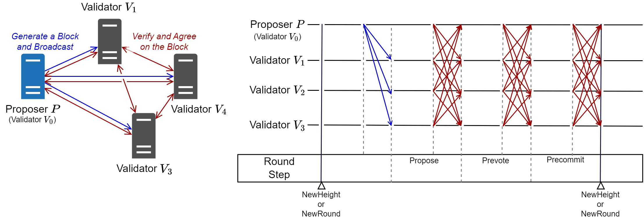 ある Proposer が提案ブロックを生成し \(\vector{V}_h\) の Validator がそれを受理または拒否する 1 つのサイクルをラウンド (round) と呼び 31-bit 値 \(r \in \{0,1,\ldots,2^{31}-1\}\) で表す。\(\vector{V}_h\) は提案ブロック \(B'_{h,r}\) の合意に失敗すると、ラウンドを一つ進めて新しい Proposer ノード \(P_{h,r+1}\) を選出し、新しい提案ブロック \(B'_{h,r+1}\) に対しての合意を再実行する (ただしラウンドの進行状況よってはラウンド \(r\) の途中から再実行することもある)。