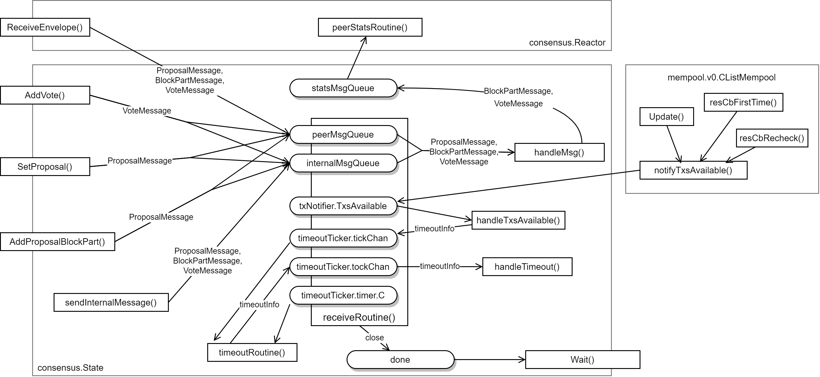 状態遷移のスレッド境界を知るためにキュー (Go で言うところの chan) によって分断されている非同期処理に注目する。consensus.State には peerMsgQueue, internalMsgQueue, statsMsgQueue, done の 4 つのキューが存在する。