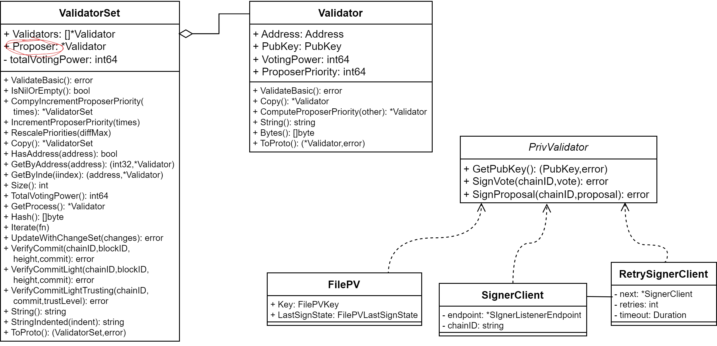 ValidatorSet には Proposer フィールドがあり、ラウンドが進行するごとに Proposer フィールドのみが変化する。ValidatorSet が参照する Validator の各インスタンスは、アドレス、署名検証のための公開鍵、Proposer 選出のための属性といった情報を持っている単なるリモートノードのエイリアスである。