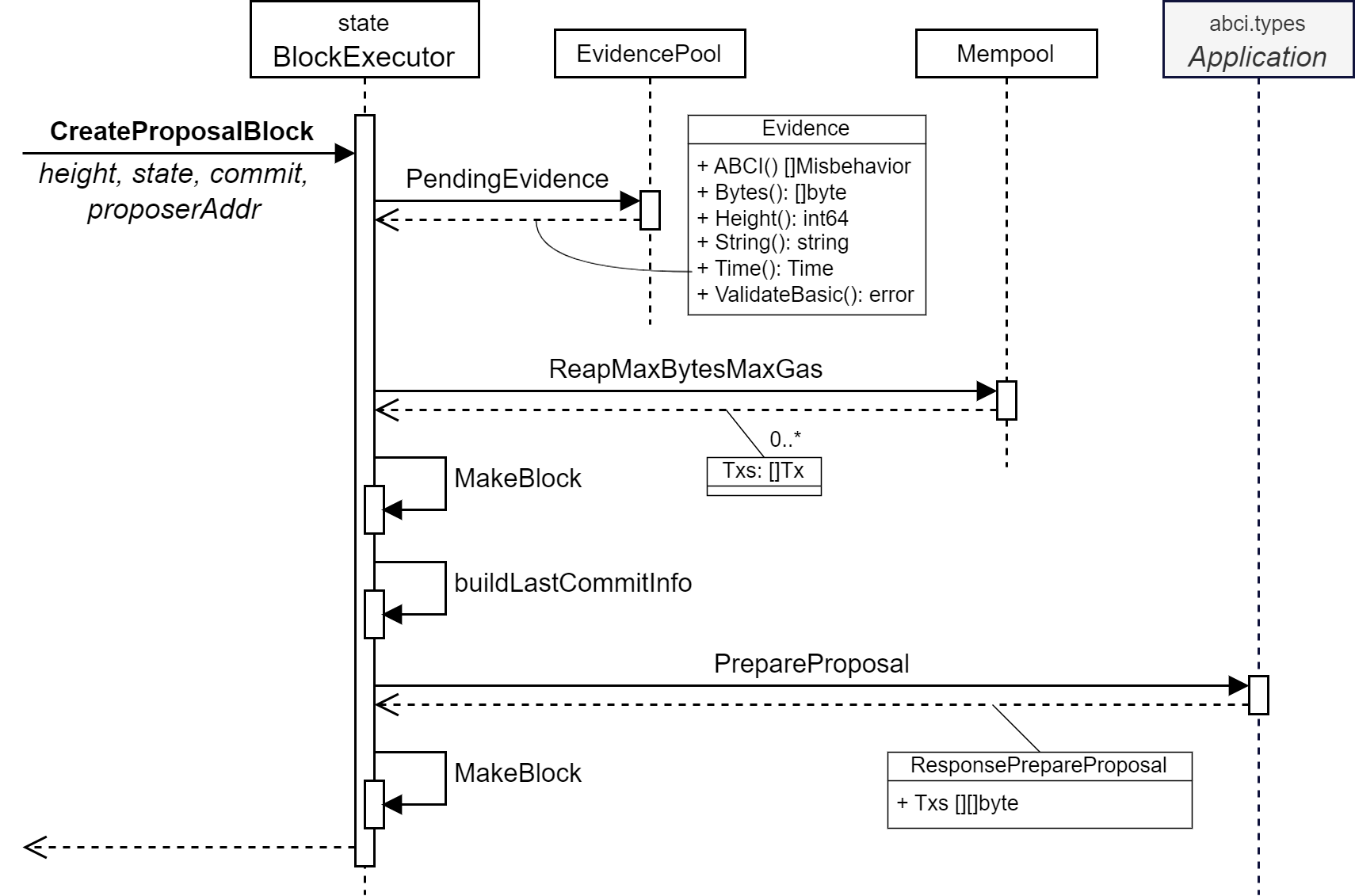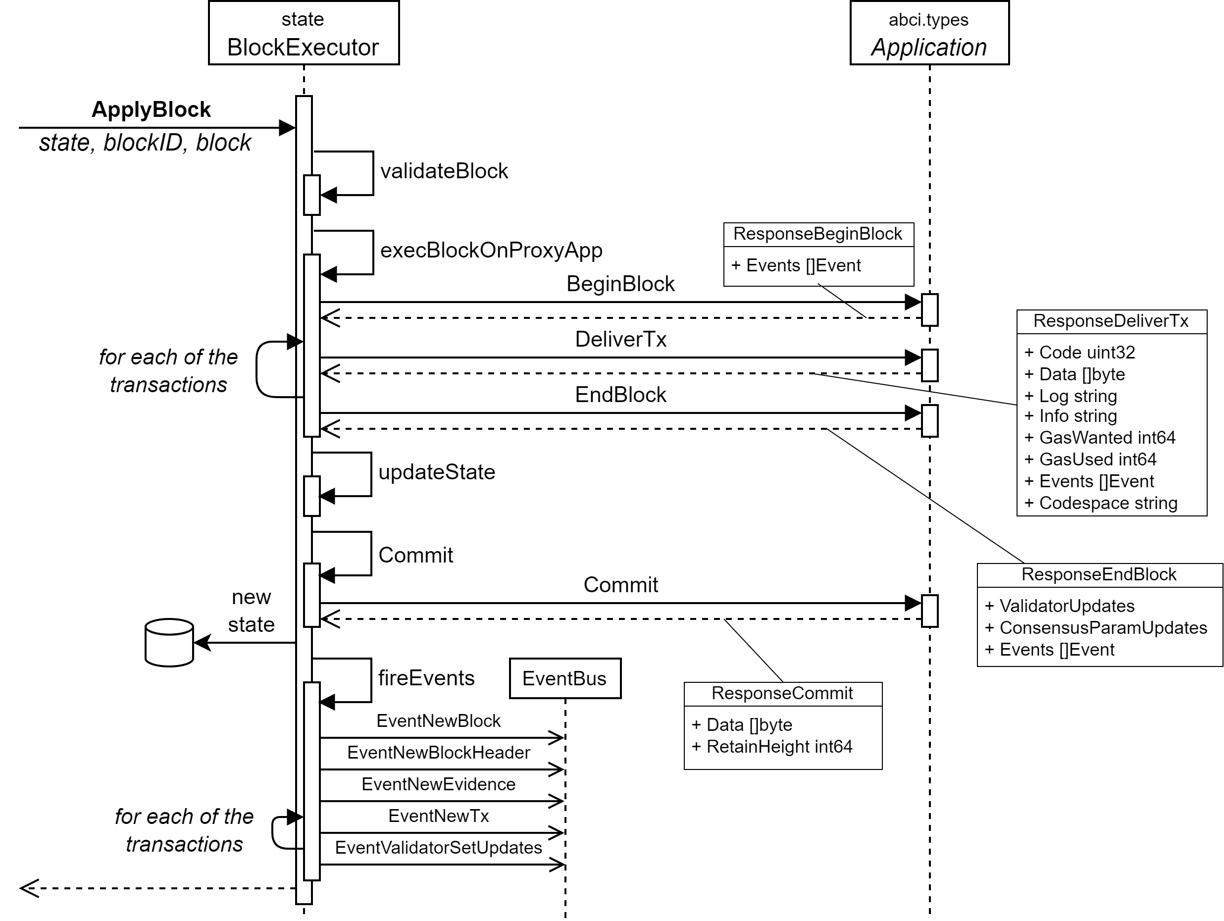 - ブロックの実行。これはブロックに含まれるすべてのトランザクションをアプリケーション実装が実行し状態を更新する。
