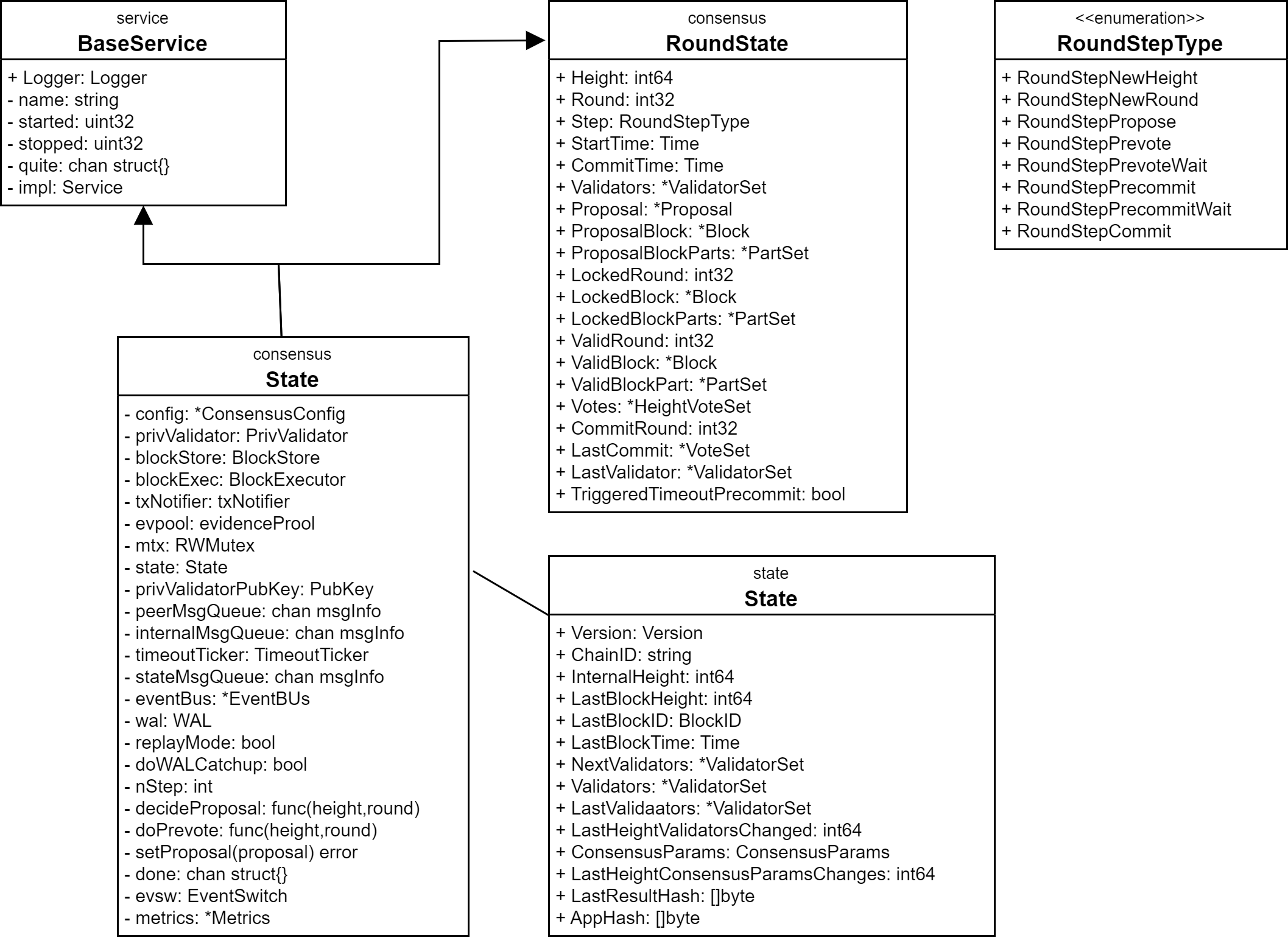 consensus.Stateは進行中のコンセンサスの状態であり、またコンセンサスの各フェーズを実行するメソッドを定義したステートマシンである。state.Stateはコミットされたブロックごとのメタ情報である。そのブロックを生成するために使用された Validator やコンセンサスパラメータなど、そのブロックを後で検証するために必要な情報をすべて保持している。