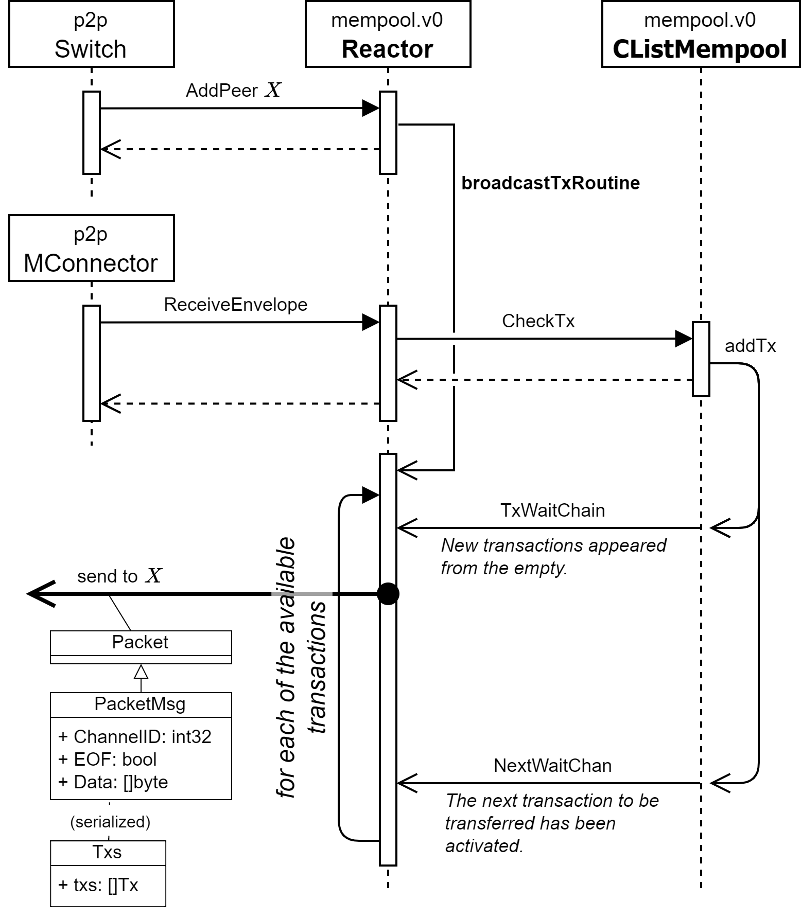 TxsWaitChan() は mempool に保存されているトランザクション数が 1→0 に変化すると新しく構築され、0→1 になると close 状態となるチャネルである。つまり有効なトランザクションが存在しないときの受信 <- はブロッキングとなり、存在するときの受信は常に即時で戻る (これはチャネルというよりシグナルとしての利用である)。したがってここでは送信すべきトランザクションを指していない next == nil 状態のときは mempool に有効なトランザクションが到着するまで待機し、到着後にその先頭を next で指すという動作になる。