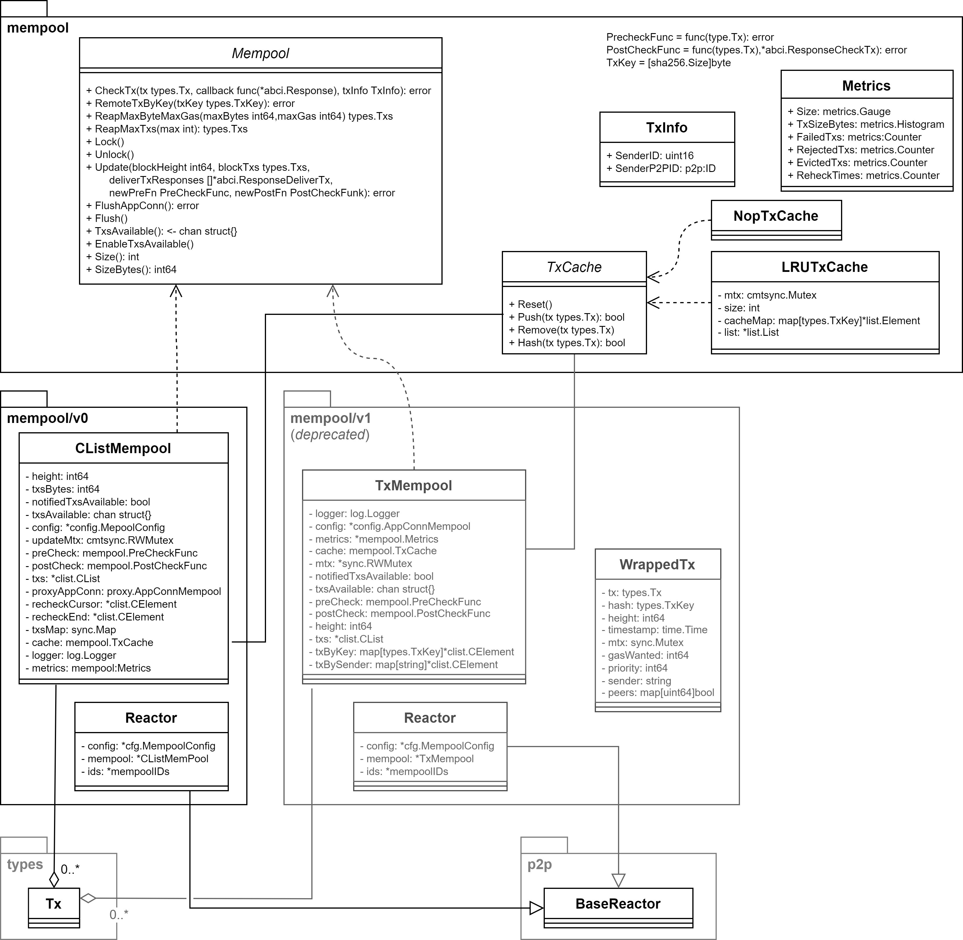 mempool の機能は mempool 以下のパッケージで実装されている。下位のパッケージに v0 と v1 が存在し、v0 は FIFO の動作、v1 は優先キューの動作だが v1 は今後のバージョンで削除されることが決定しているため v0.37 では deprecated 扱いである。どちらの実装を使うかは設定で変更することができる (デフォルトは v0)。この記事では v0 の実装を説明の対象とする。