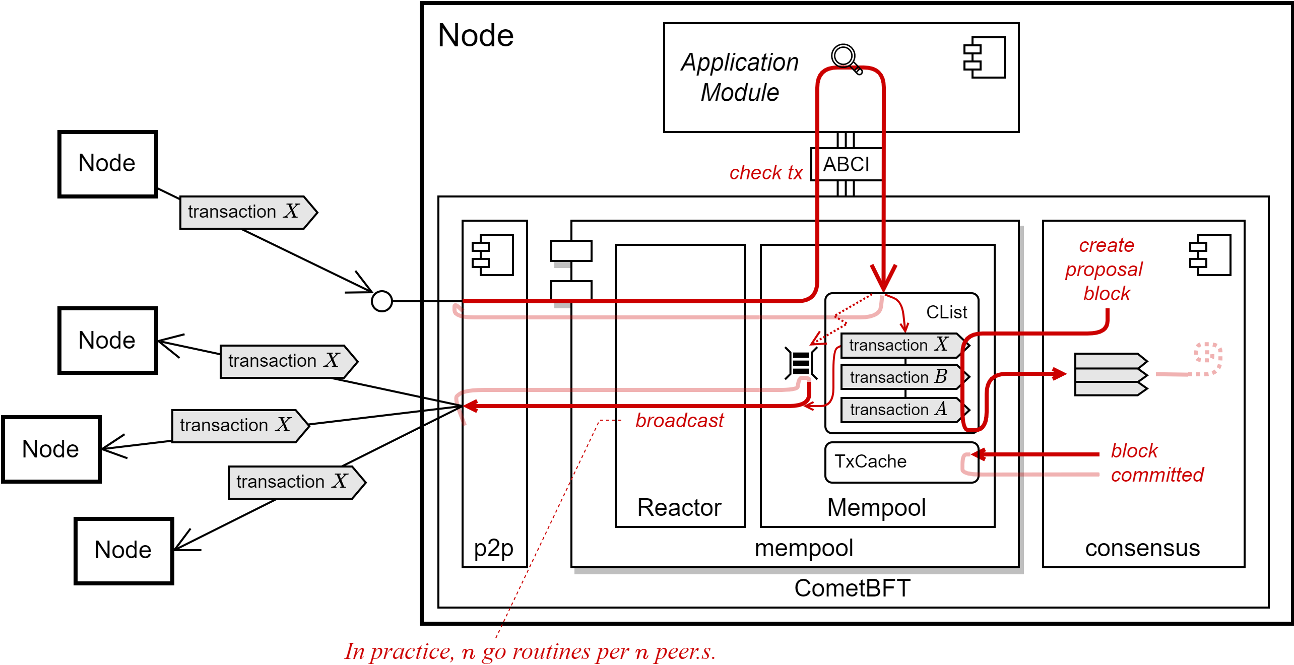 ここで未確定トランザクションの検査は ABCI を経由してアプリケーション実装まで到達することに注意。Fig 3 に示すように、現在の CometBFT 設計はこの処理をトランザクションごとに同期処理で逐次的に行っている。