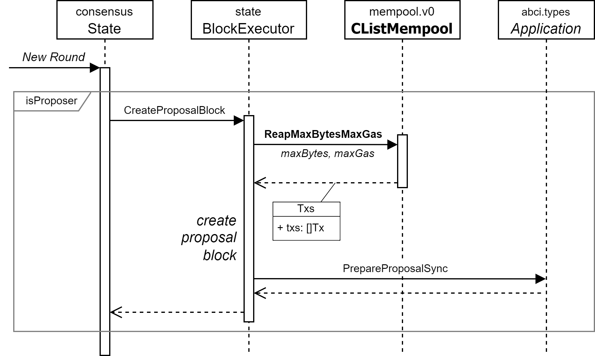 mempool に保存された検査済みの未確定トランザクションは、そのノードが Proposer となったときに提案ブロックを生成するために mempool から収集される。トランザクションの取り出しを行う ReapMaxBytesMaxGas() は未確定トランザクションの FIFO リストから指定された最大バイト長, 最大ガス量を超えない範囲で先行するトランザクションを取り出して返す。