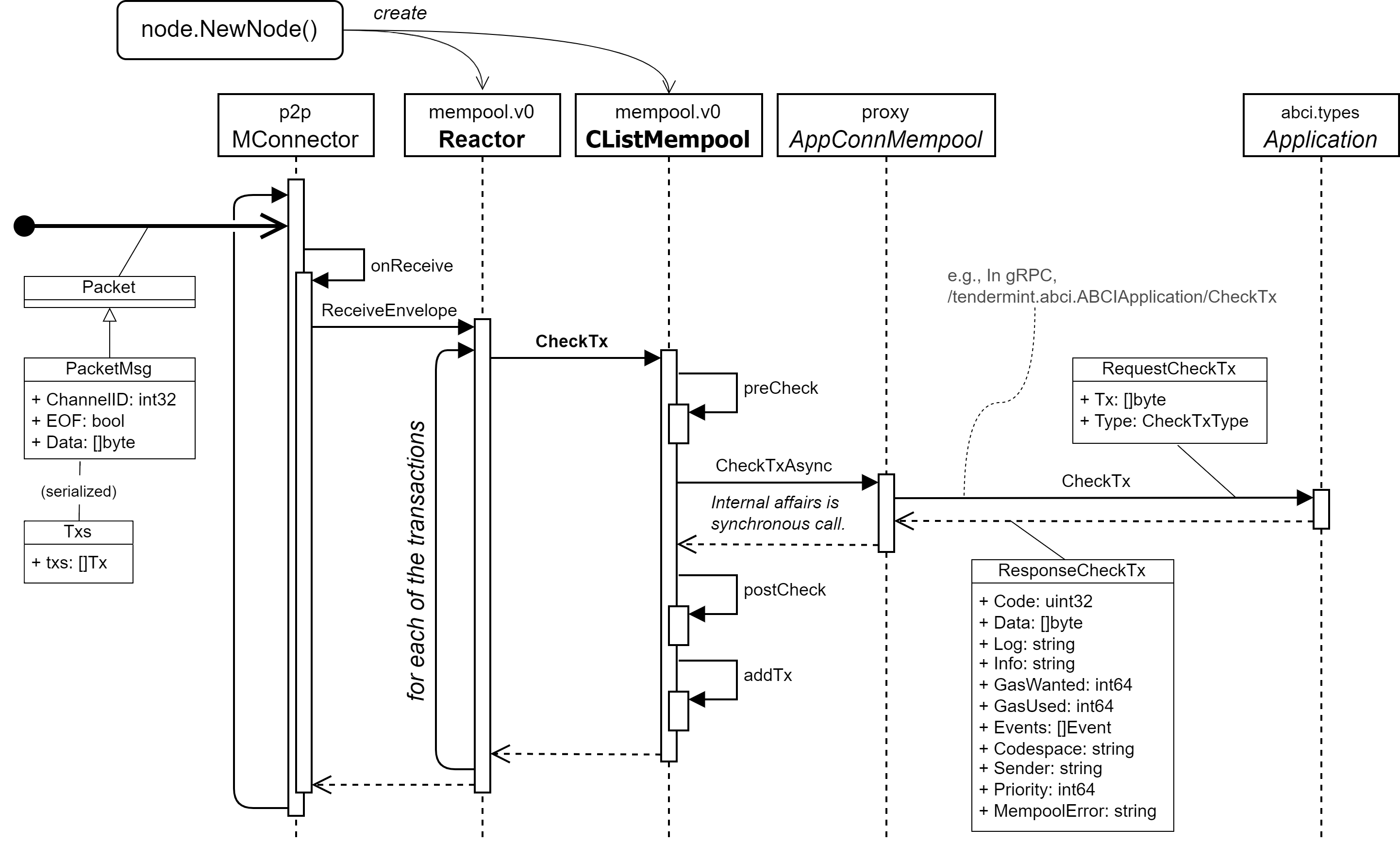 CometBFT ノードは Packet メッセージを使って未確定のトランザクションを送信している (1 つのメッセージに複数の未確定トランザクションを含んでいる)。Reactor は受信したメッセージに含まれている tendermint.mempool.Txs の各トランザクションに対して CListMempool の CheckTx() を実行することで、アプリケーションによって検査済みのトランザクションが CListMempool に保管される。