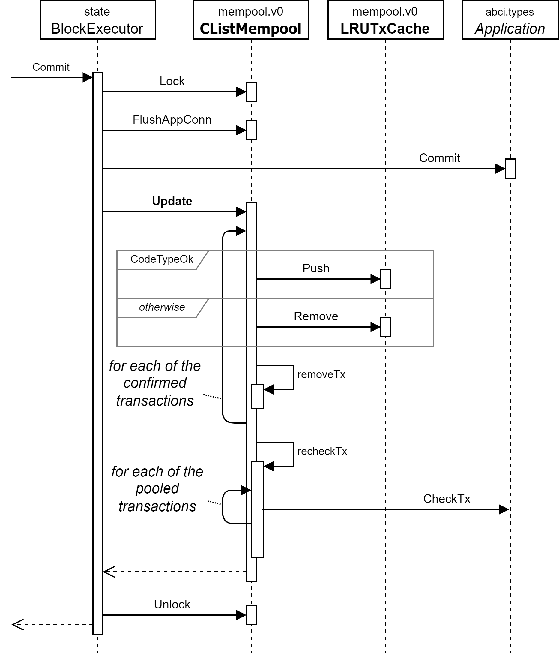 Validator の合意によってブロックがコミットされるとそのブロックに含まれているトランザクションは "確定済み" (confirmed) となる。確定済みトランザクションはもはやブロック生成には使われないので mempool から除外する必要がある。また確定済みだが未観測のトランザクションを後になって mempool が保存しないように "観測済み" として記憶する必要がある。