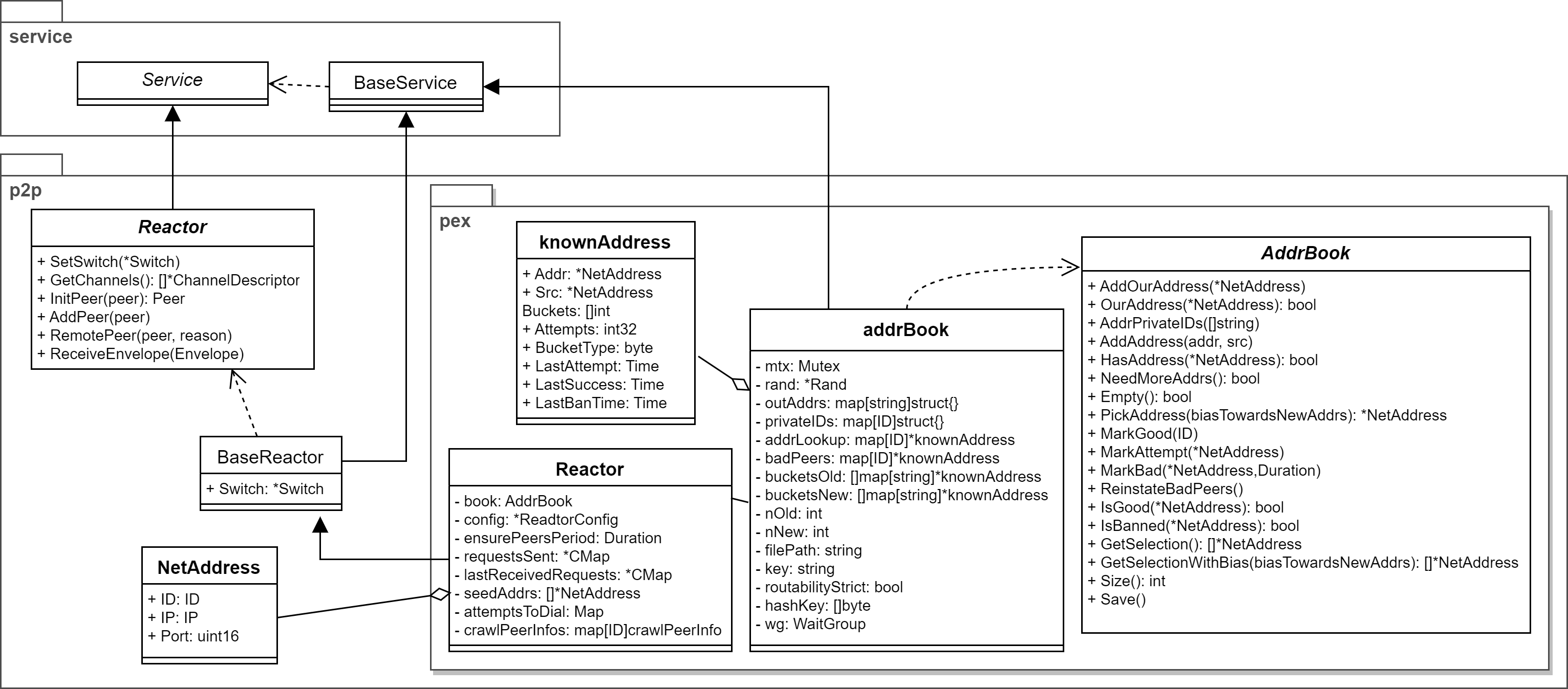 New, Old: New と Old の違いは PEX がアドレスを要求されたときに返すアドレス選択で識別される。New は一般ランクのアドレス、Old (Good) はより長期に正常駆動が確認されていて信頼できると見なされたランクのアドレスを表している。PEX は投票、またはブロック生成のイベントを与信として、ノードごとにそれらが 1000 回発生するごとにそのアドレスを Good とマークする。