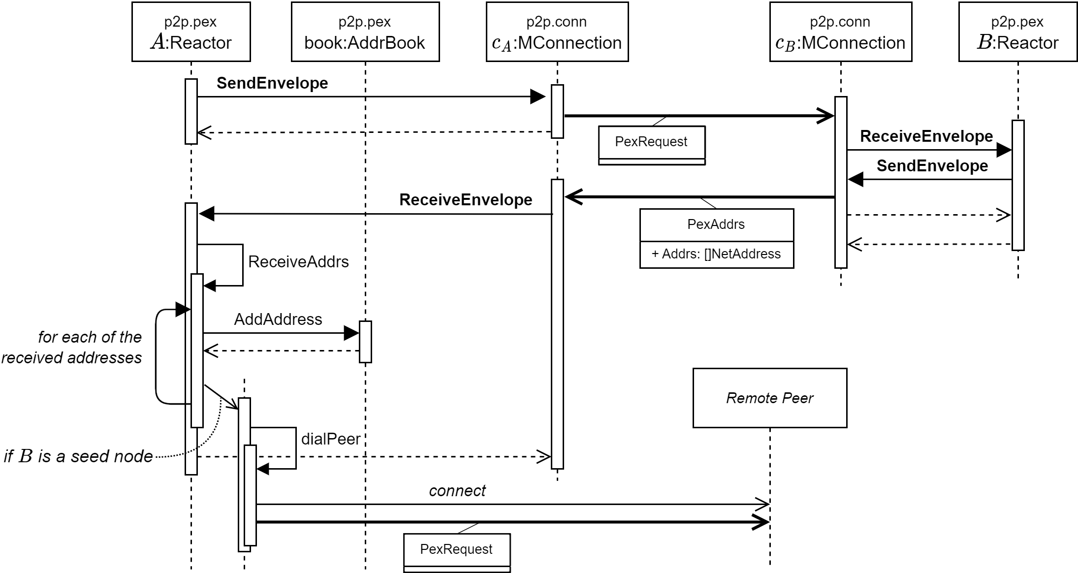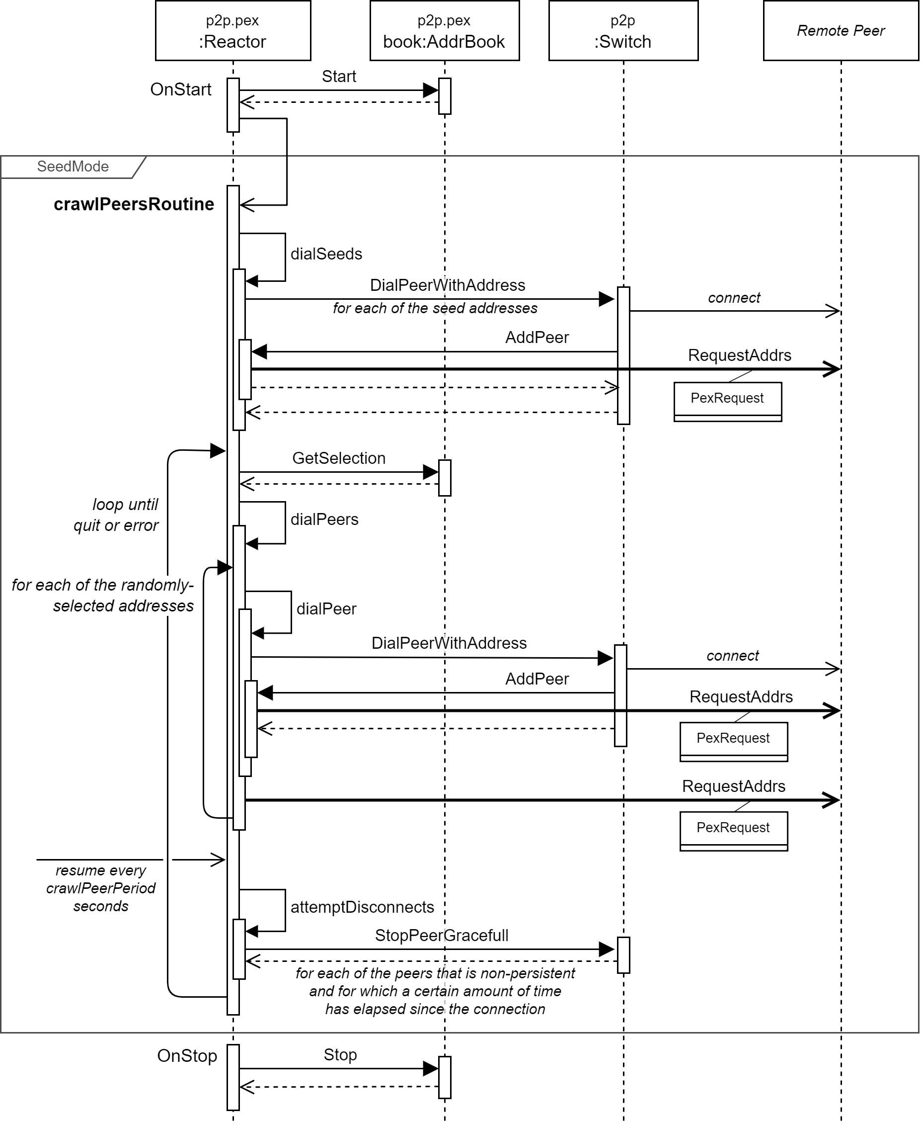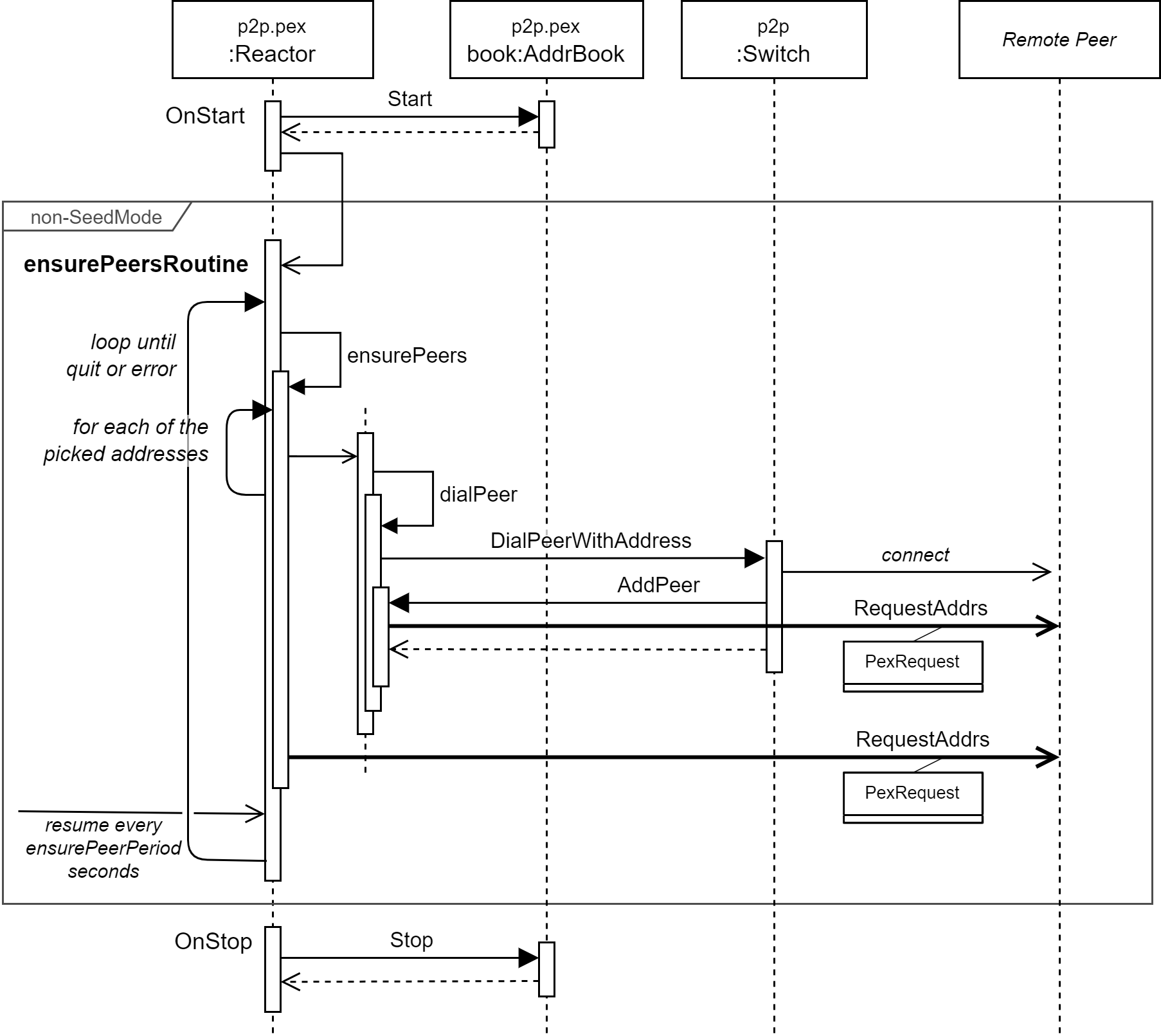 PEX リアクターはノードがシードモード (seed mode) で動作しているかどうかでアドレスキャッシュの更新動作が異なる。シードモードで起動したノードは定期的にノードを切り替えて特定のノードに過度に依存しないように自身のアドレスキャッシュを更新する。一方で非シードモードでは同じノードと長期間接続しながらアドレスキャッシュを更新するため負荷は少ない。どちらのモードでも最終的に PEX リアクターの RequestAddr が呼び出されるとノードに対してアドレス要求、具体的には PexRequest メッセージ送信が発生する。