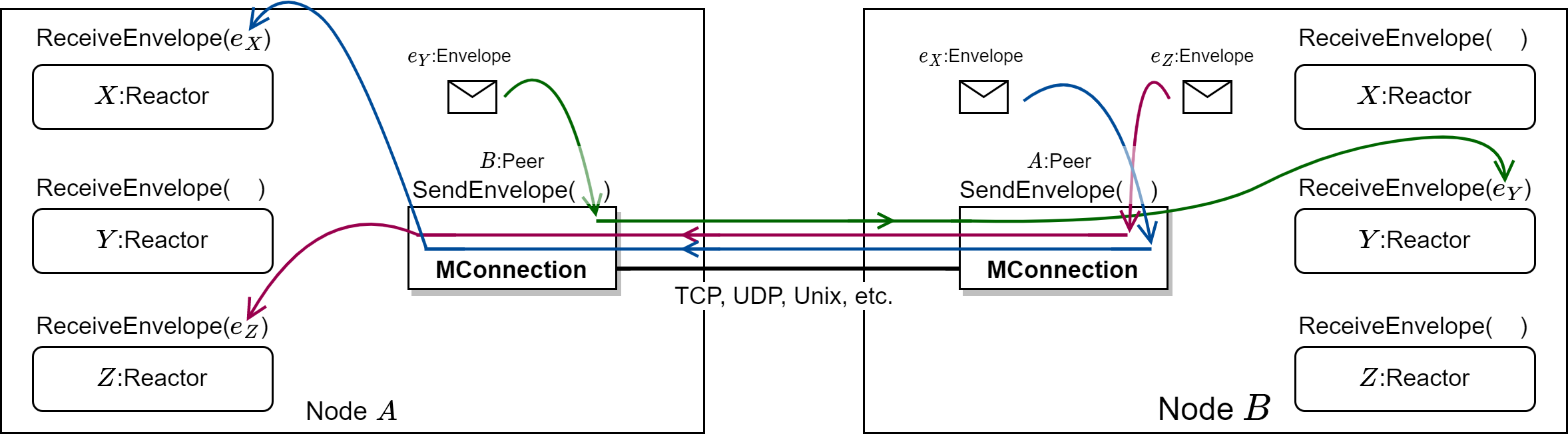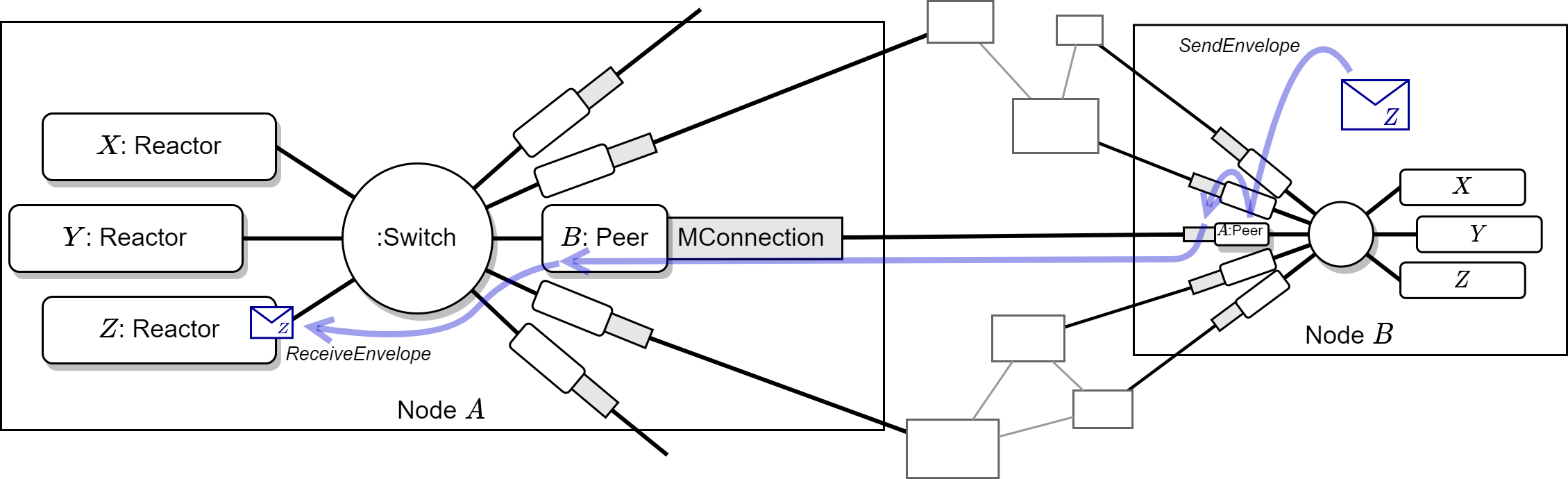 メッセージ接続 MConnection は特定のピアに対する接続の 1 セッションを表している (通常は TCP 接続を想像すると良い)。この接続の上で送受信されるメッセージ (Envelope) は 1 バイトのチャネル ID によって宛先のリアクターを識別する。これは複数のチャネル/リアクターが一つのメッセージ接続を共有して通信するいわゆるインターリーブ通信である。