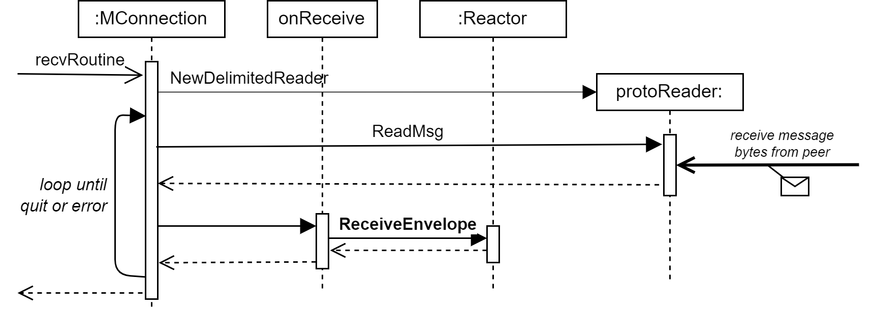 MConnection が開始すると新しいスレッドでメッセージ受信イベントループ recvRoutine を開始する。このイベントループでメッセージを受信すると onReceive コールバックが起動し、チャネル ID に対応するリアクターの ReceiveEnvelope() が呼び出される。