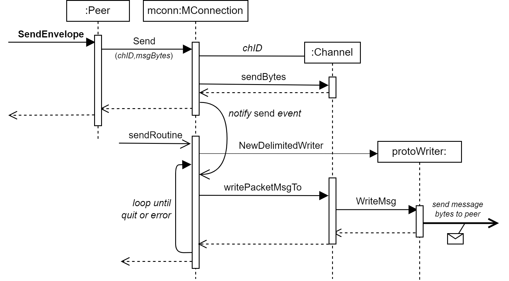 受信処理と同様に MConnection が開始するとメッセージ送信イベントループ sendRoutine を開始する。Peer インスタンスに対して SendEnvelope を呼び出すと、メッセージのバイナリは一旦 Channel のキューに保存され、メッセージ送信イベントループで非同期に送信される。