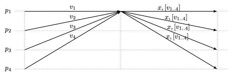 どちらの場合でも、我々のシステムモデル (すなはちゴシップベースネットワークの多数のノード) でこのメカニズムを使用すると、プロセスの数とともに通信複雑性が高くなる: 最初のケースではプロセスの総数に応じたメッセージが送信され、2つ目のケースではそれぞれのプロセスによって値 (トランザクションのブロック) が送信される。最初のステップで受信したメッセージのセットは、通常、選択された値 \(x\) の選択を正当化するために提案メッセージ (Fig 1 で \([v_{1..4}]\) で示される) に便乗している。