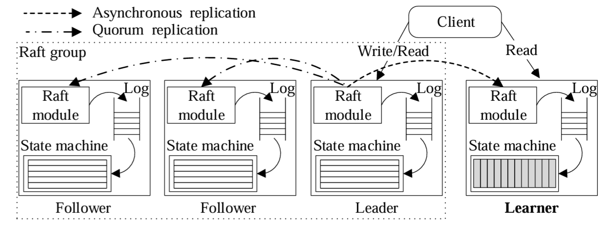 標準の Raft グループでは各フォロワーがリーダーとなって読み込みおよび書き込み要求に対応できる。したがって、単にフォロワーを増やしてもリソースを分離することはできない。さらに、フォロワーを追加するとリーダーはクライアントに応答する前により大きな定足数のノードからの応答を待つ必要があるためグループの性能に影響する。そこで我々は Raft コンセンサスアルゴリズムに学習者の役割を追加した。学習者はリーダーの選出には参加せず、ログ複製を行う定足数の一部でもない。リーダーから学習者へのログ複製は非同期であり、リーダーはクライアントに応答する前に成功を待つ必要はない。リーダーと学習者間の強い一貫性は読み取り時に強制される。評価セクションで示すように、設計上、リーダーと学習者間のログ複製の遅延は少ない。