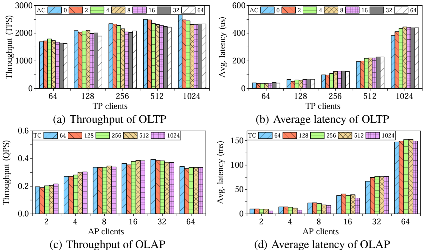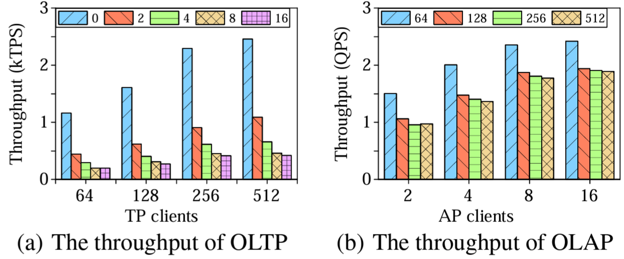 Figure 10(c) と 10(d) に示されている同様のスループットとレイテンシの結果は AP リクエストに対する TP の影響を示している。AP クエリーはコストが高くリソースを奪い合うため、AP スループットは 16 の AP クライアントですぐに最大に達する。このような競合によって AP クライアントが増加するとスループットが低下する。AP クライアント数が一定であればスループットはほぼ同じままで、最大でも 5% の低下するだけである。これは TP が AP の実行に大きな影響を与えないことを示している。分析クエリーの平均レイテンシの増加はクライアント数が増えるほど待機時間が増えることに起因する。