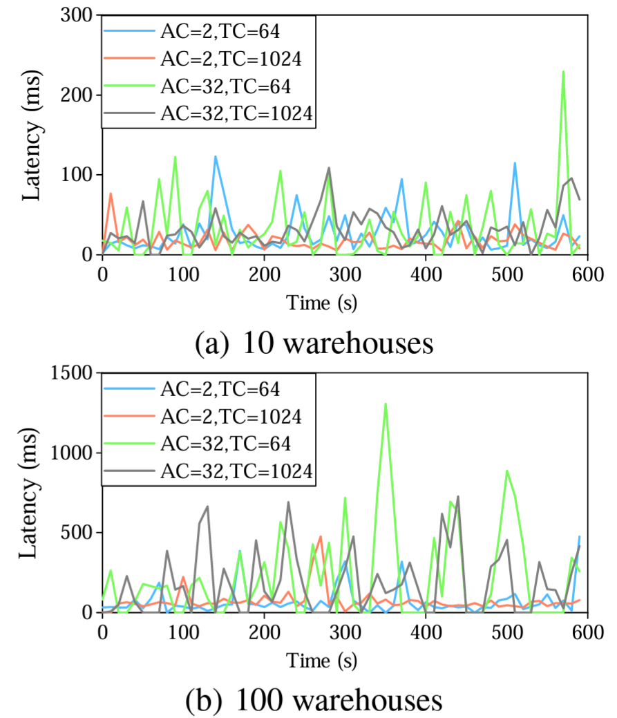 Figure 11(a) に示すように、ログ複製遅延は 10 個のウェアハウスで常に 300ms 未満であり、ほとんどの遅延は 100ms 未満である。Figure 11(b) は、ウェアハウスが 100 個になると遅延が増加し、ほとんどの遅延は 1000ms 未満であることを示している。Table 4 により正確な詳細を示している。ウェアハウスが 10 個では、クライアントの設定に関係なく、ほぼ 99% のクエリーのコストが 500ms 未満である。ウェアハウスが 100 個では、2 個と 32 個の分析クライアントで、それぞれ約 99% と 85% のクエリーが 1000ms 未満だった。これらのメトリクスは、TiDB が HTAP ワークロードで約 1 秒のデータ最新性を保証できることを強調している。