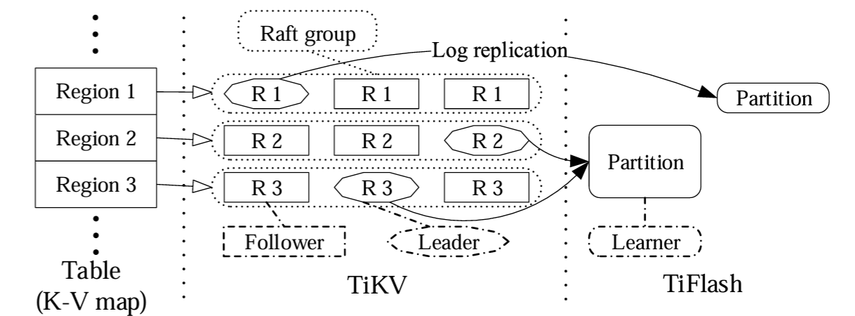 ユーザは SQL ステートメントを使ってテーブルに行形式のレプリカを設定することができる: \[ {\it ALTER \ \ TABLE} \ \ x \ \ {\it SET \ \ TiFLASH \ \ REPLICA} \ \ n; \] ここで \(x\) はテーブル名、\(n\) はレプリカ数でデフォルト値は 1 である。列レプリカの追加はテーブルに非同期で列インデックスを追加するのと似ている。TiFlash の各テーブルは TiKV の複数の連続した領域に従って多数のパーティションに分割され、各パーティションは連続した範囲のタプルをカバーする。パーティションが大きいほど範囲スキャンが容易になる。