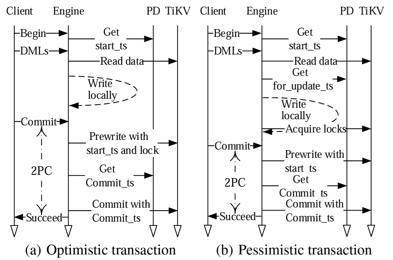 計算エンジン層はステートレスでスケーラブルである。我々のあつらえた SQL エンジンはコストベースのクエリーオプティマイザーと分散クエリーエクゼキューターを備えてい後続る。TiDB はトランザクション処理をサポートするために Percolator [33] に基づく 2 フェーズコミット (2PC) プロトコルを実装している。クエリーオプティマイザはクエリーに基づいて TiKV と TiFlush からの読み込みを最適に選択することができる。