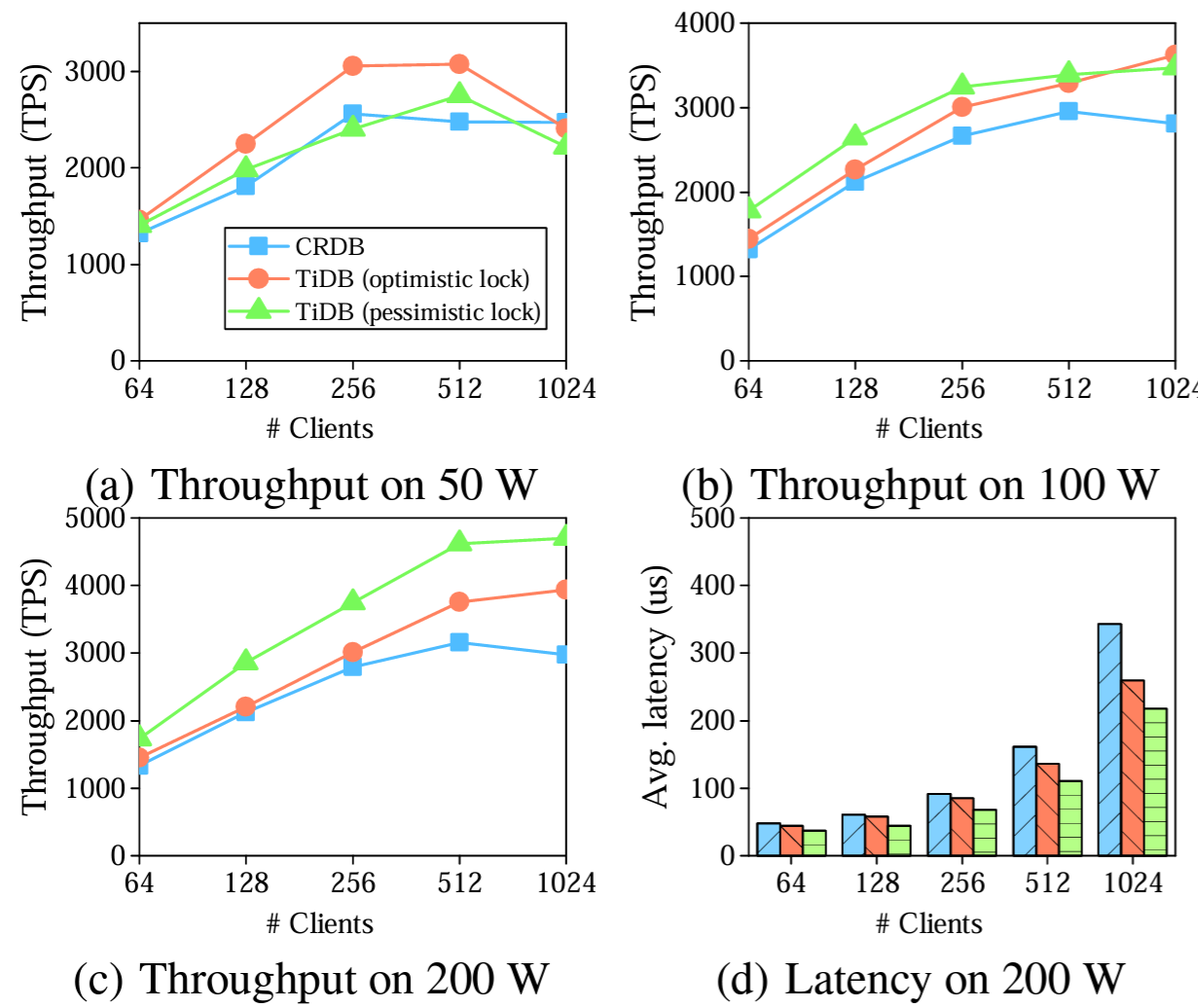 Figure 7(d) はクライアントが増えてゆくと、特にスループットが最大に達した後に、より多くのリクエストをより長い時間待機する必要があるためレイテンシが大きくなることを示している。これはウェアハウスが少ないとレイテンシが大きくなる理由でもある。特定のクライアントでは、スループットが高くなると TiDB と CRDB のレイテンシが短くなる。50 ウェアハウスと 100 ウェアハウスでも同様の結果が得られる。