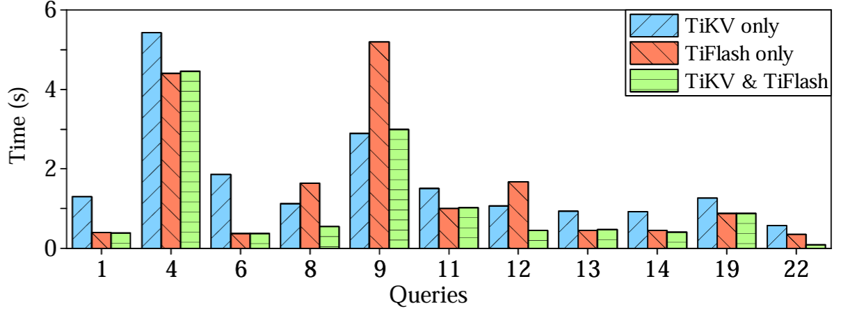 Q1, Q4, Q6, Q11, Q13, Q14, Q19 では TiFlash のみのケースの方が TiKV のみのケースよりも性能が良く、TiKV と TiFlash のケースでは TiFlash のみのケースと同じ性能が得られている。これらの 7 つのクエリーで葉理由が異なる。Q1 と Q6 は主に 1 つのテーブルに対する集約で構成されているため、TiFlash の列ストアで実行する方が時間がかからず最適な選択となる。これらの結果は過去の研究で説明されている列ストアの利点を協調している。Q4 と Q11 はそれぞれ同一の物理プランを用いて個別に実行されている。ただし、TiFlash からのデータスキャンは TiKV よりも安価であるため、TiFlash の身のケースでは実行時間が短く、これも最適な選択である。Q13, Q14, Q19 にはそれぞれ 2 回のテーブル結合が含まれており、ハッシュ結合として実装されている。TiKV のみのケースでは、ハッシュテーブルをプローブするとインデックスリーダーを最小するが、これも TiFlash からデータをスキャンするよりもコストが高くなる。
