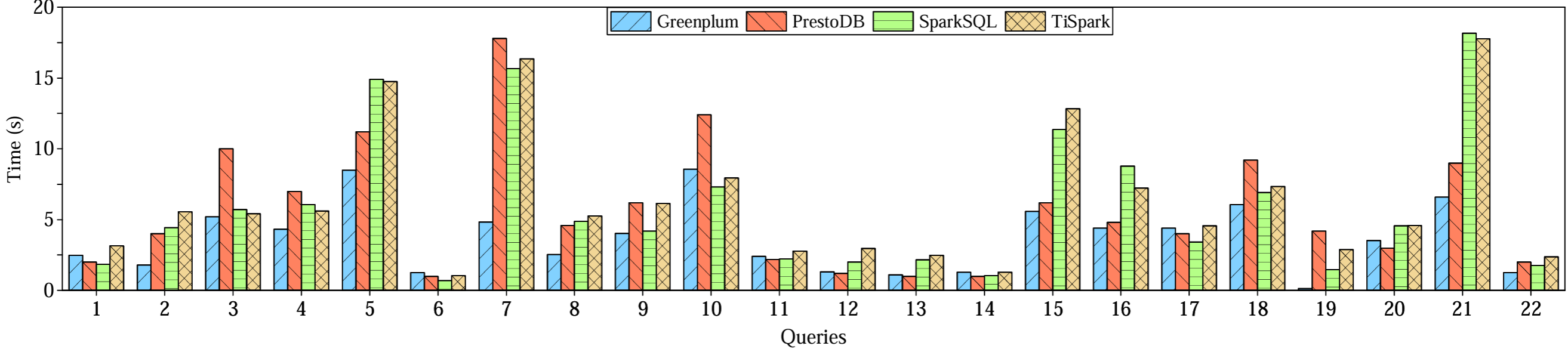 さらに、500 ウェアハウスの CH-benCHmark の 22 個の分析クエリーを使用して TiSpark と SparkSQL、PrestoDB、Greenplum を比較する。各データベースは 6 台のサーバにインストールされている。SparkSQL と PrestoDB では、データは Hive の列指向 Parquet ファイルとして保存される。Figure 9 はこれらのシステムの性能を比較したものである。TiSpark の性能は同じエンジンを使用しているため SparkSQL に匹敵する。性能の差はかなり小さく、主に異なるストレージシステムへのアクセスに起因する。圧縮された Parquet ファイルのスキャンの方が低コストであるため、SparkSQL は通常 TiSpark よりも優れている。ただし TiSpark がより多くの計算をストレージ層にプッシュできる場合、その利点が相殺されるケースもある。TiSpark を PrestoDB や Greenplum を比較することは、SparkSQL (TiSpark の基礎となるエンジン) と他の 2 つのエンジンとの比較になる。ただしそれ以上は本稿の範囲外であるため詳細には議論しない。