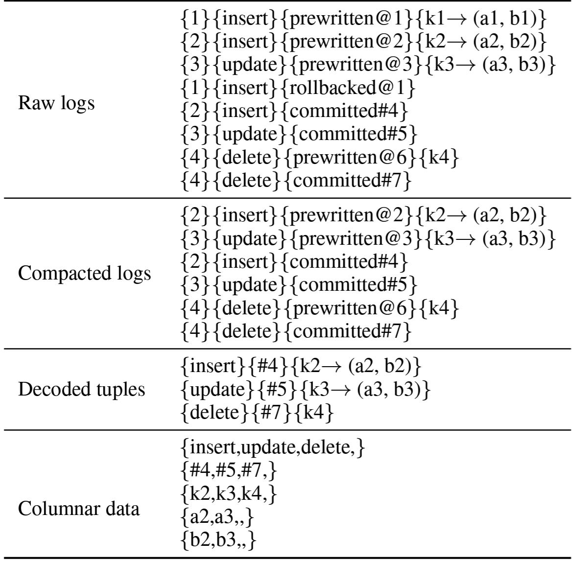 Table 1 に示す我々の例では、2 つのタプルを挿入し、1 つのタプルを更新し、1 つのタプルの削除を試みる 8 つの項目が生ログに含まれている。しかし k1 の挿入はロールバックされるため、8 つの生ログのうち 6 つの項目のみが保存され、そこから 3 つのタプルがデコードされる。最後に、デコードされた 3 つのタプルは operation types, commit timestamps, keys および 2 つのデータ列の 5 つの列に変換される。これらの列は DeltaTree に追加される。