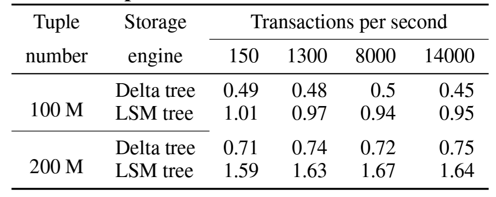 ワークロード. 我々の実験は CH-benCHmark を使用したハイブリッド OLTP および OLAP ワークロードで実施される。ソースコードはオンラインで公開されている [7]。このベンチマークは標準の OLTP および OLAP ベンチマークである TPC-C と TCP-H で構成されている。このベンチマークは TCP-C ベンチマークの未修正バージョンから構築されている。OLAP 部分には HPC-H にヒントを得た 22 の分析クエリーが含まれており、そのスキーマは TPC-H から CH-benCHmark スキーマに適合され、さらに TPC-H のリレーションが 3 つ欠落している。実行時に 2 つのワークロードは複数のクライアントによって同時に発行され、実験ではクライアントの数が異なる。スループットはそれぞれ 1 秒あたりのクエリー数 (QPS) または 1 秒あたりのトランザクション数 (TPS) で測定される。CH-benCHmark のデータ単位は TCP-C と同様にウェアハウスと呼ばれる。100 ウェアハウスで 70GB のメモリを使用する。