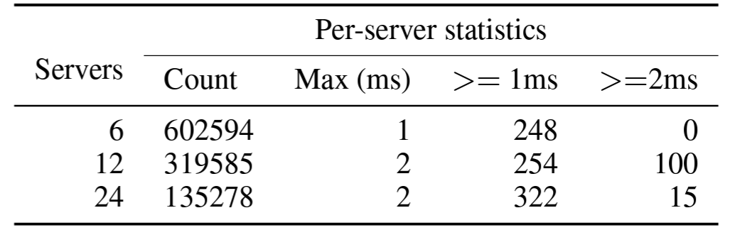 潜在的なボトルネックになる可能性があるため、我々は PD からのタイムスタンプ要求の性能を評価する。1200 のクライアントを使用して継続的にタイムスタンプを要求する。クライアントはクラスタ内のさまざまなサーバに配置されている。TiDB をエミュレートするように、各クライアントはバッチで PD にタイムスタンプ要求を送信する。Table 3 に示すように、6 台のサーバはそれぞれ 1 秒間に 602594 個のタイムスタンプを受信できる。これは TPC-C ベンチマークの実行時に要求される速度の 100 倍以上である。TPC-C を実行すると TiDB は 1 サーバあたり最大で毎秒 6000 個のタイムスタンプを要求する。サーバ数を増やすと、各サーバで受信されるタイムスタンプの数は減少するが、タイムスタンプの総数はほとんど変わらない。この速度は現実の需要を大きく上回っている。レイテンシに関しては 1ms または 2ms かかる要求は極わずかである。現時点では、我々は PD からタイムスタンプを取得することは TiDB の性能のボトルネックにはなっていないと結論づけている。