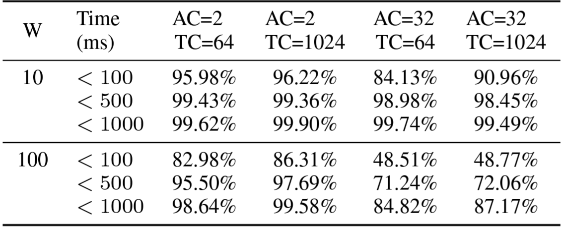 Figure 11(a) と (b) を比較すると、遅延時間はデータサイズに関連していることがわかる。ウェアハウスの数が多いほどデータが増えて同期するログが増えるためレイテンシが大きくなる。さらに、遅延は分析リクエストの数にも依存するが、トランザクションクライアントの数による影響はより少ない。これは Figure 11(b) を見れば明らかである。32 個の AC は 2 個の AC よりレイテンシが大きくなる。しかし、分析クライアントの数が同じであればレイテンシに大きな違いは無い。より正確な結果を Table 4 に示す。100 個のウェアハウスと 2 つの AC ではクエリーの 80% 以上が 100ms 未満で完了するが、32 の AC で 100ms 未満で完了するのは 50% 未満である。これは、分析クエリーが増えるとログの複製頻度が高くなるためである。