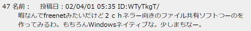 Winny は 2002 年に匿名掲示板「にちゃんねる」で最初に公開された (この投稿番号の 47 にちなんで作者である金子勇は名が公表されるまで 47 を自称していた)。WinMX のメンテ放棄によって WinMX ネットワークが崩壊し始め、日本では OpenSNAP を模索していたところに Winny が登場した形となり、元々音楽ファイルなどを違法に交換していたアンダーグラウンドユーザの間で急速に普及した。