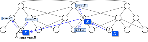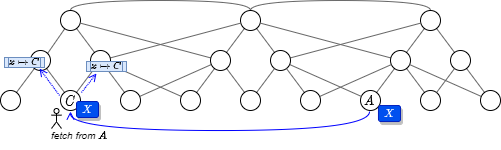 ファイル \(X\) の実体をキャッシュしているノード \(A\) からファイルを入手するケースでは、ノード \(C\) はノード \(A\) と直接接続してファイルをダウンロードする。ダウンロードしたファイルは \(C\) 上でキャッシュされ、通常の公開手順と同様に隣接するノードに新しいマッピング情報 \(x \mapsto C\) が配布される。