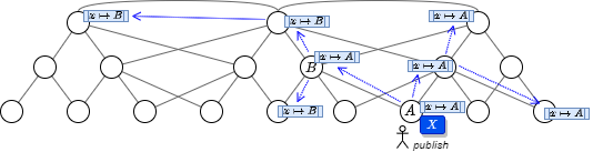 ここで注目したい動作は、このマッピング情報は中継するノードによって一定の確率で書き換えられて拡散されることである。例えば Fig 2 に示した図ではノード \(B\) が (\(x \mapsto A\) のマッピングを記録した上で) \(x \mapsto B\) のマッピングに置き換えて拡散している。これは後述する中継の動作を意図としたものである。