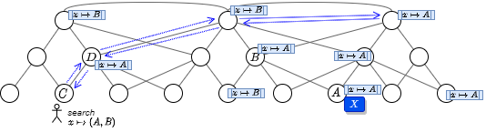 Fig 3 の例ではこの検索手順によってユーザが \(x\) の問い合わせ先リスト \((A,B)\) を入手したことを示している。また \(x\) のマッピングをキャッシュしていないノード \(D\) にクエリーの応答に含まれているマッピング \(x \mapsto A\) (\(B\) でもかまわない) が新たにキャッシュされている。