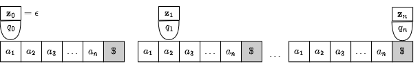 pd-スタックの実体はプッシュダウン記号の有限集合 \(\Gamma\) 上の列である。この列の先頭に \(\Gamma\) 上の記号を push したり pop することでスタックとしての機能を持たせる。pd-スタックは初期状態で \(z_0=\epsilon\) であり \(z_i \in \Gamma^*\) の状態を取る。入力を最後まで読み切ったときに \(q_n \in F\) かつ \(z_n=\epsilon\) であればオートマトンは入力された列を受理したことを意味する。