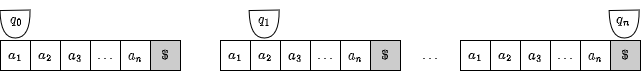 オートマトンは状態を持ち、状態は入力によって変化し、出力は内部状態によって決まる。この動作はしばしばテープに記録された入力とそれを読み出して状態を更新しながら移動するヘッドに例えられる。Fig 1 は初期状態を \(q_0\) とし、\(n\) 個の記号の並び \(a_1 a_2 \ldots a_n\) を入力として状態を更新する様子を表している (\(\$\) は入力が終端に達したことを示すエンドマーカーである)。