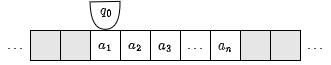 チューリングマシンの初期状態は \(q_0\) で、読み出し位置は作業領域内の入力記号列の先頭を指している。読み出した記号と現在の状態から内部状態を更新し、現在の読み出し位置の記号を書き換え、読み出し位置を左右のどちらかに 1 つ移動する。このとき、読み出した記号をそのまま書き込むのであれば、書き込まずに読み出し位置を移動することと同等である。