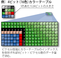 赤、青、緑 3 つのカラーチャネルそれぞれに 8 ビット (256) の諧調があれば人間の目で識別できる全ての色が表現できる (24ビット色)。しかし少ない色数しか使用していない画像に 1 ピクセル 3 バイトもの幅を持たせるのは効率が悪いため、カラーテーブルに定義した色のインデックスのみをピクセル情報に持たせることでデータサイズを小さくすることができる。つまりカラーテーブルとは RGB 色データを定義した配列と等価である。