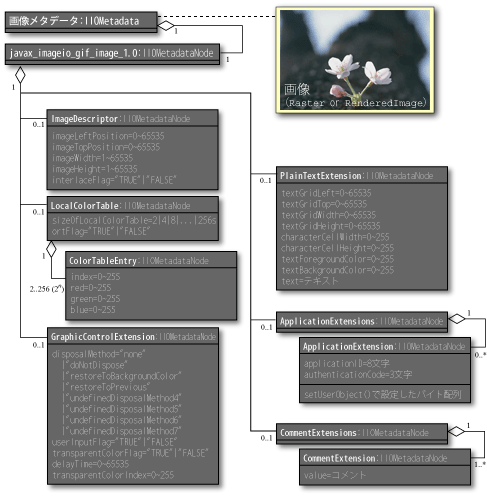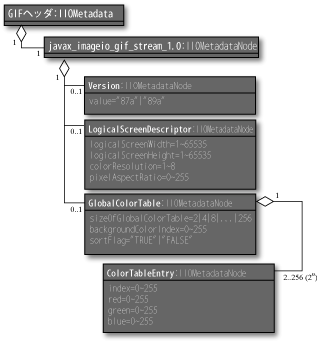 を取得後は try-finally で囲って画像出力処理を終了する時に確実にクローズする必要がある。Iterator<ImageWriter> it = ImageIO.getImageWritersByFormatName("GIF"); if(! it.hasNext()){ throw new IllegalStateException(); } ImageWriter writer = it.next(); ImageOutputStream out = ImageIO.createImageOutputStream(file); writer.setOutput(out); - GIF ヘッダの設定