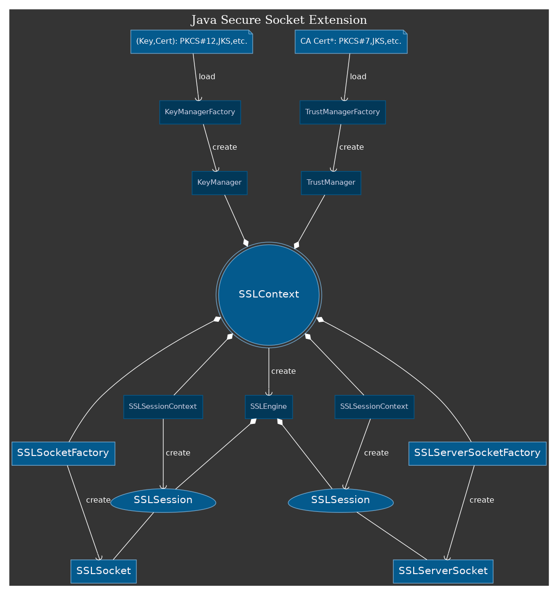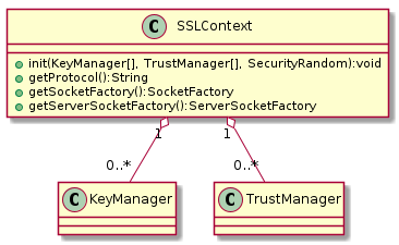SSLSocket, SSLServerSocket はそれぞれ SSLContext を通じて SSLSocketFactory, SSLServerSocketFactory から生成することができる。