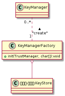 TLS 通信のサーバ側や、クライアント認証を行うクライアント側ではローカル側の身元を証明するための秘密鍵と証明書を使用した KeyManager を指定する必要がある。