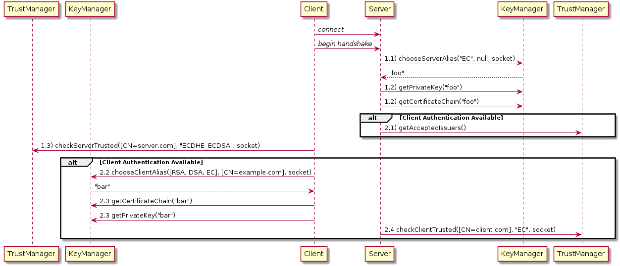 TLS ハンドシェイク時の KeyManager, TrustManager の挙動をまとめよう。下記 Alt 部分は TLS クライアント認証が有効なときに行われる処理である。