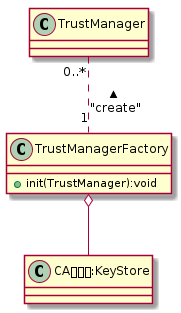 TrustManager は TLS ハンドシェイクで得た通信相手の証明書が信用できるかを検証する役割を持つ。デフォルトでは Java ランタイムにバンドルされている一般的な CA 証明書のいずれかから発行されているかなどを検証する。