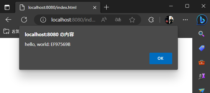 hello_world.jsをインポートしていますが、このファイルは呼び出しを簡単にするために wasm-pack によって生成されたラッパーです。greeting()処理の実体は WebAssembly として実行されています。Fig 1 はこの index.html を Web ブラウザで表示した結果です。リロードするたびにメッセージに付属する16進数がランダムに変わり、また Rust コード内で使用した