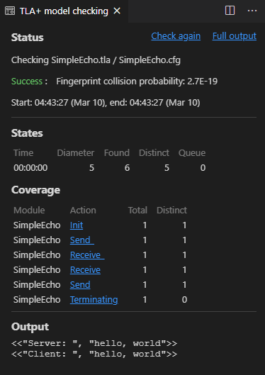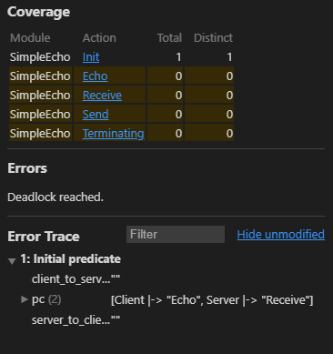 例えば Example 3 のラベルを以下のように書き換えたとしよう。状態変数の初期化が終わった時点で server_to_client = "" であるため 12 行目の await により TLC は Client プロセスの Echo ステップを開始することができない。同時に client_to_server = "" であるため Server プロセスの Receive ステップも開始できない。結果的に TLC は実行可能なステップを見つけることができずデッドロックが発生していると判断する。
