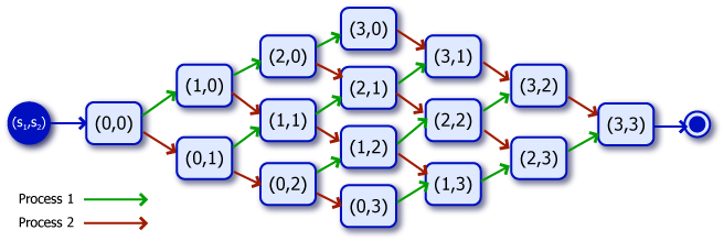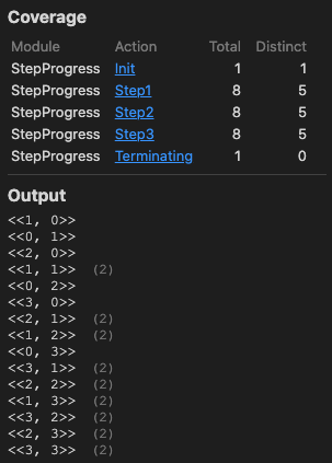 直感的に 2 プロセス × 3 ステップ = 6 の実行が行われると思うかもしれないが、結果の Output はもっと多い実行を示している。マルチプロセスでは (ステップが進行可能であれば) Process 1 が進行するケースと Process 2 が進行するケースのそれぞれを実行するためである。結果的にこのモデルでは \((0,0)\) から \((3,3)\) までのすべてのステップの組み合わせが実行され、Fig 2 で表される状態遷移図 (有限オートマトン) のようにすべての進行状況の組み合わせを再現する。